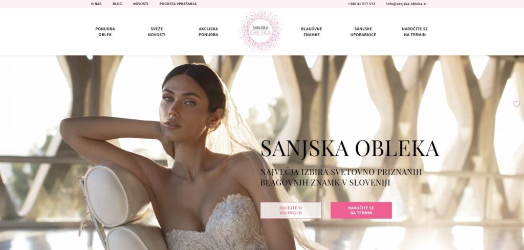 Sanjska-obleka je eden vodilnih poročnih salonov v Sloveniji, ki slovi po izjemno široki izbiri poročnih in večernih oblek. Salon je specializiran za moderne, a hkrati brezčasne kreacije, ki združujejo kakovostne materiale, popolne kroje in izjemno udobje. Nevestam ponujajo osebno svetovanje, pomerjanje ter prilagoditev obleke po meri, kar zagotavlja, da bo vsaka obleka pristajala kot ulita. Poleg oblek imajo na voljo tudi pester izbor dodatkov, kot so tančice, nakit in poročni čevlji, kar omogoča celostno izkušnjo v enem samem obisku.